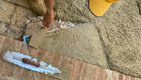 Paolo is making sure the courtyard is prepared for the brick border and concrete aggregate.